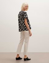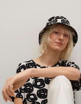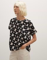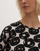 Das Printshirt aus einem BCI Cotton Mix ist mit einem kunstvollen Druck versehen. Der Print wirkt wie ein breiter Pinselstrich, der durch kreisende Bewegungen erzeugt wurde. Die Silhouette ist weit gehalten und mit einem überschnittenen Kurzarm versehen.
